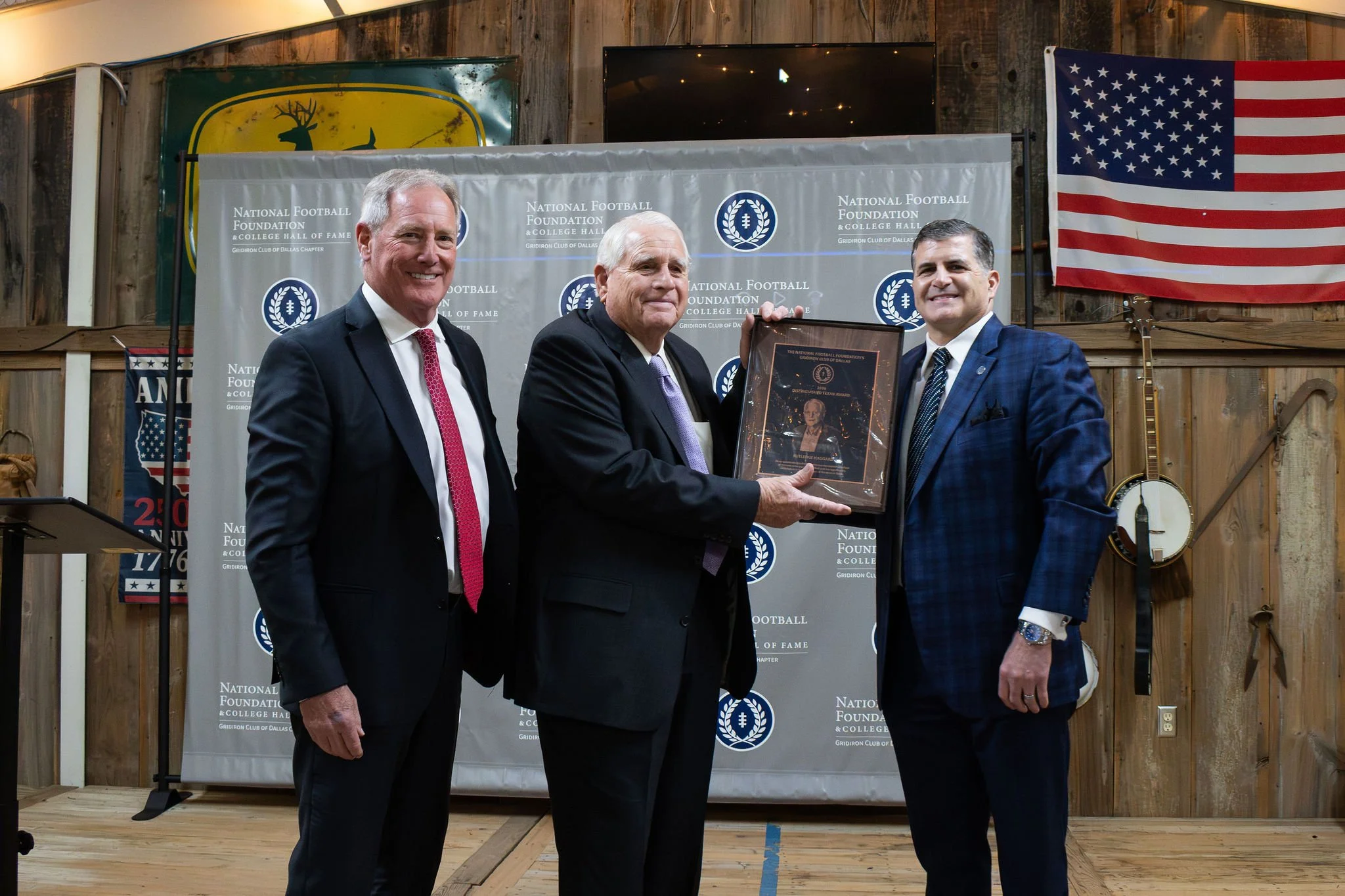 Pictured (L to R): president, NFF Gridiron Club of Dallas, Gerald Brence, Distinguished Texan, Rutledge Haggard, and COO, National Football Foundation, Matt Sign.